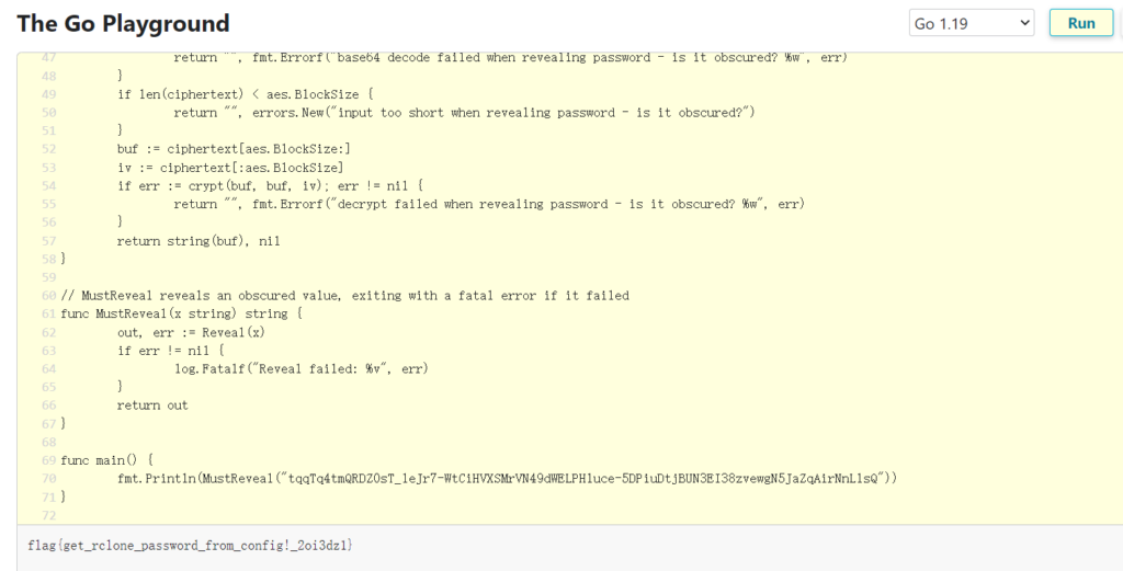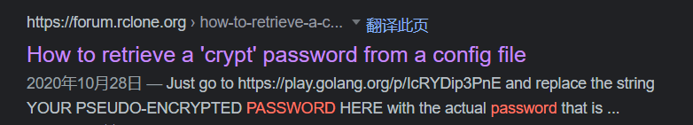 那么另一个flag肯定不是明文存储的了,根据提示,应该是藏在Rclone配置文件里,即.config/rclone/rclone.conf,打开该文件发现,pass字段为一串疑似加密的内容:pass = tqqTq4tmQRDZ0sT_leJr7-WtCiHVXSMrVN49dWELPH1uce-5DPiuDtjBUN3EI38zvewgN5JaZqAirNnLlsQ,猜测明文就是flag。问题是我连Rclone都没用过,根本不了解它到底是如何加密密码的。因此只能去搜一下,这里我搜中文没搜到啥内容,搜 how to decrypt the pass in rclone config file 这句话时,搜到了一条: