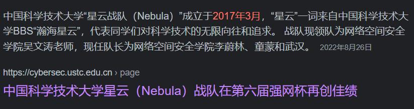 - 第一题,Google搜索 中国科学技术大学 NEBULA 战队 成立,即找到答案: