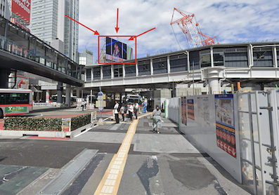 接下来需要知道出站口在哪里,搜了一下最后一幅图,发现是位于渋谷的任天堂旗舰店,然后去地图里导了个航看看从上野站到任天堂旗舰店的路线,得到目的站点为渋谷站,在Google map查看该站附近的全景地图,确实发现了一个广告牌: