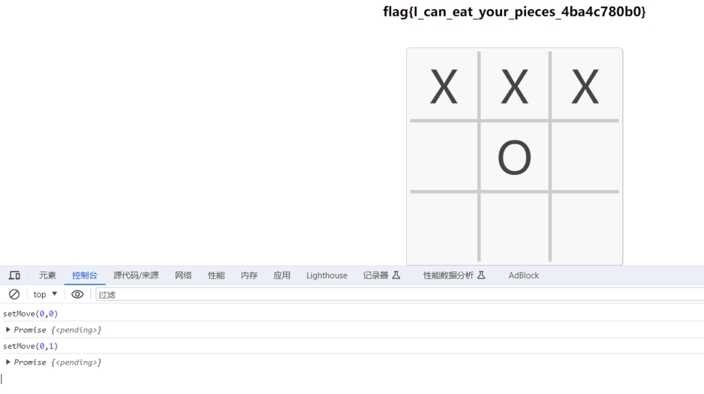 试了一下发现只要在f12的console界面依次执行两个setMove:setMove(0,0);setMove(0,1);然后点一下坐标(0,2)位置,即可赢下游戏: