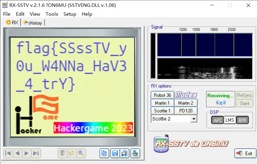 音频题没什么思路,于是搜了一下题目里说的“通过无线信道传图片 国际空间站 ISS”等信息,搜到一个叫SSTV的东西,然后顺理成章搜到解码工具RX-SSTV,下载一下用来解码。